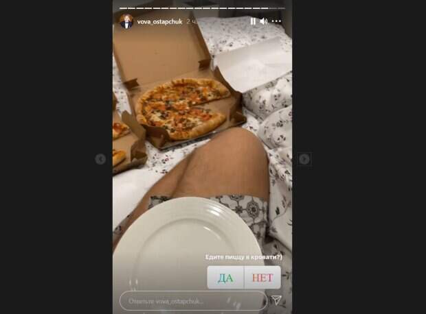 На кадрах можно увидеть обнаженные ноги Остапчука, который лежит в кровати. Рядом с ним две уже начатые коробки пиццы. Также понятно, что возле ведущего кто-то лежит. Судя по всему, это его жена Кристина Горняк. По признанию самого Остапчука, они с супругой «обнаглели» настолько, что едят прямо в кровати. «Остапчуки в конец обнаглели. Мы едим пиццу прямо в кровати. Вечер семейного кино», - произносит за кадром ведущий. Для совместного просмотра пара выбрала фильм «Гордость и предубеждение». Как известно, Владимир Остапчук и Кристина Горняк поженились осенью 2020 года. Их отношения начались со скандала, ведь ведущий завел роман на стороне еще будучи женатым. Его развод с первой женой и матерью двоих его детей был очень громким. Сейчас ведущий пытается добиться возможности регулярно видеть своих детей. Напомним, новая жена Остапчука кайфонула на прогулке с мужем, кадры идиллии: «Синхронизация…». Как сообщала Politeka, Остапчук поиздевался над растерянной женой за рулем, кадры уже в Сети: "Вы провтыкали...". Также Politeka писала, что новая жена Остапчука в полностью прозрачном наряде показала, чем надо соблазнять: "Пошленько...".