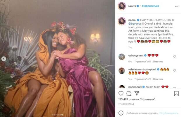 «С днем рождения королева Бейонсе! Единственная в своем роде, скромная душа, твоя преданность делу - это форма искусства !! Пусть ты продолжишь это десятилетие с еще большим Духовным Огнем, чем мы когда-либо видели. !! С любовью к тебе N!» - написала Наоми. Поклонники также поддержали: «Какие чудесные️❤️; команда мечты ❤️; люблю вас обоих; Красиво ❤️; Королевы; какое прекрасное фото; Невероятные кадры, конкурентки