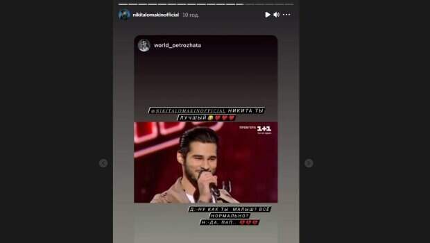 "В 2019 году у меня был масштабный тур по Украине под названием Ventigo. Тогда Никита пел на разогреве тура и большого концерта во Дворце спорта. Он очень талантливый певец, поэтому мне интересно, что ты сделала с ним", — сказал Балан. Также Ломакин рассказал свою историю знакомства с Даном Баланом.  «Расскажу мою любимую историю. Я очень хотел познакомиться с Даном в туре, и после концертов я каждый раз стоял у гримерной и ждал его. Так прошло 4 концерта, а я его так и не встретил. Тогда я подумал, что возможно, он не хочет со мной знакомиться. Но в пятом городе я все же увидел Дана. Он шел мне навстречу и сказал: вот мы и познакомились, только у меня есть один вопрос, где ты все время пропадал?» «Мы не знали об этом», - сказала Тина Кароль, когда Ломакин начал рассказывать историю. Никита Ломакин продолжит свое участие в проекте на месте Дениса Калитовского, который ушел из шоу. Напомним, что Ломакин из "Голоса країни" восхитил улыбкой, лежа в кровати: "Счастлив, как никогда…" Как сообщала Politeka, Тина Кароль научила плохому экс-бойфренда Мишель Андраде, кадры попали в сеть: «Мама-кошка» Также Politeka писала, что Ломакин из "Голоса країни" одним движением смутил Дорофееву и позаигрывал с Кароль, видео: "Зажег"