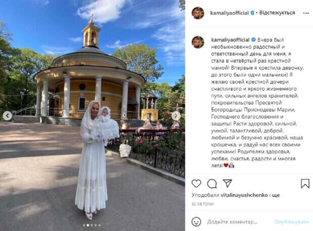 Так, в этот раз звезда поделилась радостным событием – она стала крестной мамой маленькой девочки, и показала кадры с церемонии крещения. На снимках видно, что для праздничного обряда Камалия выбрала длинное белоснежно платье интересного кроя, которое красиво подчеркнуло ее изящную фигурку. Свой образ она дополнила белым кружевным платком, под которым спрятала волосы, а на ее лице легкий макияж. певица прижимает к груди маленькую девочку, которая стала ее крестницей. В подписи к фотографиям Камалия рассказала, что малышка стала первой девочкой среди ее четырех крестников, а также написала ей теплые пожелания. "Вчера был необыкновенно радостный и ответственный день для меня, я стала в четвёртый раз крестной мамой! Впервые я крестила девочку, до этого были одни мальчики", - написала артистка. Пользователи тут же принялись комментировать снимки: "Настоящая Фея из сказки "Золушка" Вы, Камалия", "Обе красавицы", "Невероятные", "Поздравляю", "Девочка очень симпатичная", "Как же красиво", "Сколько нежности в одном фото", "Какое счастье". Напомним, Самую богатую певицу Украины обвинили в проплате концерта ко Дню независимости, звезда не выдержала: "Муж здесь не причем!". Как сообщала Politeka, Самая богатая певица Украины, показав мужа-миллиардера, предсказала будущее страны: "Очень скоро. ..". Также Politeka писала, что Самая богатая певица Украины показала, как развлекаются ее дочки в Турции: "Экстремальные малышки".