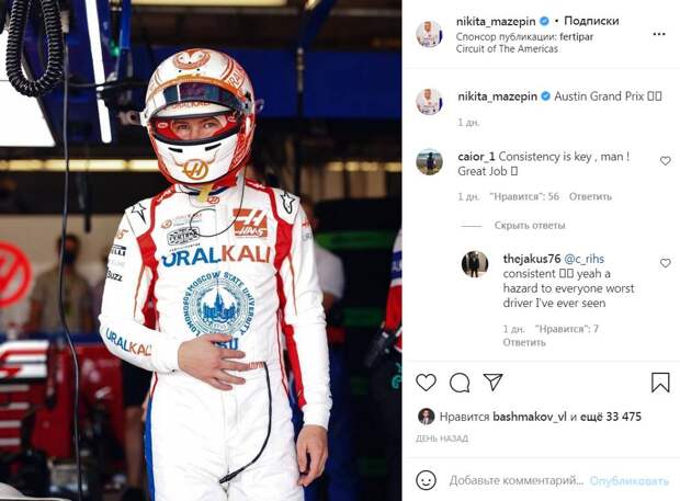 Еще три болида сошли с дистанции по ходу гонки, поэтому позиции гонщиков Haas не 19 и 20, а чуть повыше. Мазепин объяснил свой проигрыш напарнику по команде слишком длинным пит-стопом на первом же круге — у гонщика оторвался подголовник. С такой поломкой пилотировать болид запрещено правилами, поэтому Мазепин был вынужден свернуть в боксы и ожидать, когда механики устранят неполадку. Это отбросило его далеко от хвоста пелетона. «Во втором повороте первого круга в машине оторвался подголовник. Он поднялся и закрыл мне оба зеркала — мне пришлось спрашивать у команды, есть ли вокруг другие машины — я просто не знал, куда могу сместиться. Пит-стоп для закрепления подголовника стоил мне потери 25 секунд, после чего я ехал в одиночестве и пытался проехать дистанцию с одним пит-стопом, но при столь жаркой погоде и с такими шинами это оказалось невозможно», — рассказал Мазепин. Однако это не единственные проблемы, с которыми пришлось столкнуться гонщику из России, дебютанту «Формулы-1», во время этапа в США. Проблемы начались еще раньше, когда Мазепину отказывали в американской визе. Для ее получения ему пришлось отправиться в Мексику и пропустить выходные с семьей. С аналогичными проблемами перед этапом W Series столкнулась и российская гонщица Ирина Сидоркова. Ее в итоге так и не пустили в США. Все же попав на этап в Остин Мазепина ждали новые приключения. Во время тренировок у него возникли проблемы с шлемом. «У меня большие проблемы с экипировкой Bell в этом году, с визорами. Иногда они поставляют бракованную деталь, и с правой стороны она пропускает воздух. На скорости 330 км/ч он бьет точно в открытый правый глаз. Естественно, он начинает слезиться и выделять много жидкости, а потом краснеет — не слишком приятно. Ощущение, словно едешь на мотоцикле без защитных очков», — рассказал Никита. Неудачи не закончились и на этом. Во время второй сессии свободных заездов у Мазепина вдруг раскалились педали. Он тут же пожаловался на проблему команде по радио. «Просто плачу в машине, ступни горят. Как если бы они стояли на чем-то очень горячем. Нужно расследовать», — отчитался Никита. За пять гонок до конца своего дебютного сезона Никита Мазепин занимает последнюю строчку личного зачета пилотов. Несмотря на неудачный сезон, команда уже продлила контракт с гонщиком на следующий год, в надежде что машины команды нового поколения станут более конкурентноспособными, а гонщики наберутся опыта.