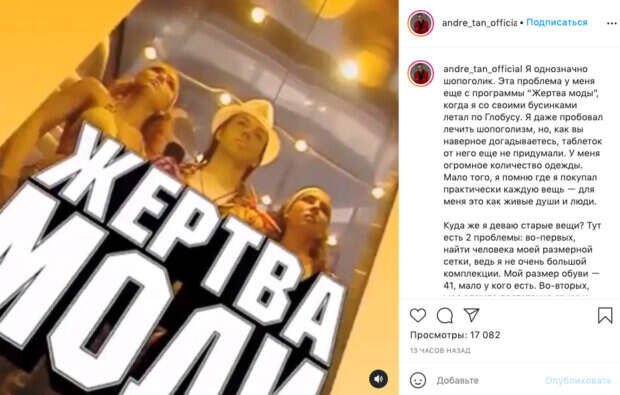 Так, на этот раз Андре Тан опубликовал новое видео на своей странице в Инстаграм. На кадрах моменты из программы "Жертва моды", в которой он был ведущим. Под видео он решил поделиться своим признанием. "Я однозначно шопоголик. Эта проблема у меня еще с программы “Жертва моды”, когда я со своими бусинками летал по Глобусу. Я даже пробовал лечить шопоголизм, но, как вы наверное догадываетесь, таблеток от него еще не придумали. У меня огромное количество одежды. Мало того, я помню где я покупал практически каждую вещь ー для меня это как живые души и люди. Куда же я деваю старые вещи? Тут есть 2 проблемы: во-первых, найти человека моей размерной сетки, ведь я не очень большой комплекции. Мой размер обуви ー 41, мало у кого есть. Во-вторых, моя одежда достаточно яркая и смелая, подойдет мягко говоря не всем. Тем не менее, я активно раздариваю старую одежду. У меня есть 3 ветки гардероба: рабочий (бизнес), уикенд и одежда для съемок. Раздаю по соответствию разным людям: начиная от коллег по работе, заканчивая друзьями и телеведущими, которые могут надеть такую же яркую и неординарную одежду", - поделился Андре Тан. Ранее сообщалось, Андре Тан опять стал завидным холостяком и рассказал, какая женщина ему нужна: "Надышаться свободой" Также, Андре Тан показал украинкам, как нельзя одеваться осенью и в чем лучше остаться дома: "Не загоняйте себя в хандру" Politeka рассказывала, Андре Тан эмоционально обратился к экс-жене, которой оставил большой дом и новое авто: "Ты всегда была. .."