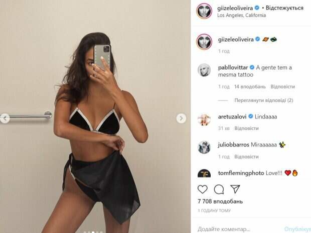 Так, Оливейра примерила откровенный черный топ с оригинальным узором и молнией посередине, который удачно подчеркнул тонкую талию, упругий бюст и изящные плечи модели. Дополнили образ черные джоггеры, собранные в аккуратный пучок волосы и небольшие кольца-сережки. Смуглая красавица использовала минимум макияжа, продемонстрировав идеальную кожу и тонкие черты лица. "Это и называется красота", "Шикарная", "Вау, ты всегда выглядишь потрясно", "Самая красивая женщина", "Твоя тень выглядит, как Мулан", - пишут поклонники в комментариях. Ранее Жизель Оливейра взбудоражила жаркими кадрами, примерив образ восточной принцессы. Ангел Victoria's Secret надела черный купальник и прозрачную юбочку, которая придала особой пикантности фото. Жизель без лишней скромности задрала юбку, чтобы поклонники могли рассмотреть ее аппетитные бедра. Напомним, горячая брюнетка из Victoria’s Secret наклонилась на камеру в смелом топе без белья. Как сообщала Politeka, Жизель Оливейра из Victoria’s Secret сжала бюст тесным корсетом, засветив лишнее: «Принцесса Бразилии». Также Politeka писала, что модель Victoria’s Secret без стыда и купальника пошалила на пирсе: такое тело нельзя прятать.