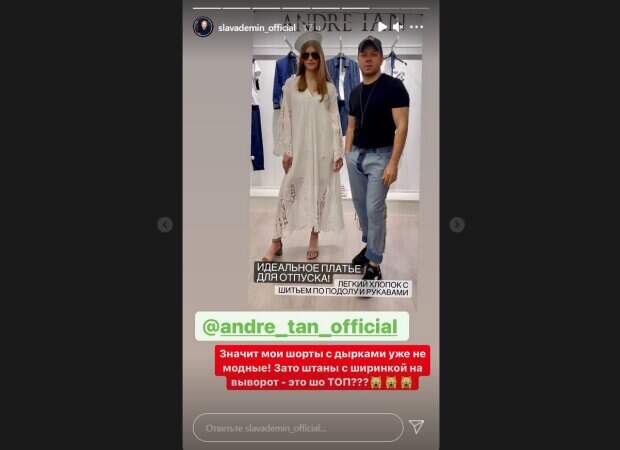 Недавно между Деминым разгорелся шуточный конфликт со знаменитым дизайнером Андре Таном. Он начался с того, что модельеру не понравились шорты ведущего. Как пишет Politeka.net, в своем Инстаграм Демин отметился с новым выпадом в адрес Тана. Так, ведущий опубликовал фото дизайнера, который недавно выпустил новую коллекцию одежды совместно с Катей Осадчей. На снимке Тан позировал рядом с моделью в белом платье. Дизайнер был одет в простую черную футболку и светлые джинсы. При этом область ширинки на них выглядела вывернутой наизнанку. Демин не упустил шанса подшутить над своим «противником». «Значит мои шорты с дырками уже не модные! Зато штаны с ширинкой навыворот – это шо топ?», - с иронией подписал снимок ведущий. Отметим, ранее Андре Тан раскритиковал Демина, который оделся не по погоде. Дизайнеру не понравилось, что приятель надел дырявые шорты в дождь. "Шортики я бы сжег на костре. Еще и с дырками, фу", - не удержался Андре Тан. После этого Тан еще раз раскритиковал лук Демина на модном мероприятии. Дизайнер заявил, что его приятель одет «бедненько, но чистенько». Напомним, "любимец" Кароль и ведущий «Голосу країни» попал под новую раздачу Андре Тана из-за гардероба: "Бедненько. ..". Как сообщала Politeka, "любимец" Тины Кароль попал под раздачу Андре Тана из-за внешнего вида: "Еще и с дырками, фу". Также Politeka писала, что ведущий "Голосу країни" отшил известного певца с непристойным предложением: "Обиделся и...".