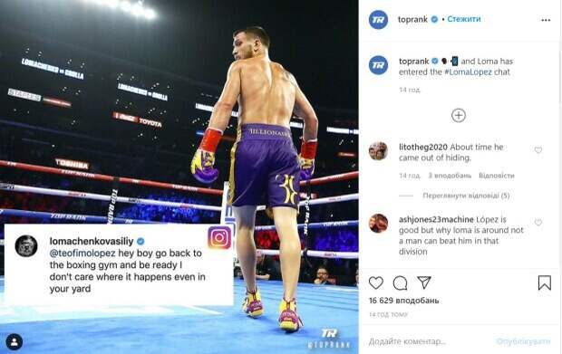 Украинский боксер Василий Ломаченко (14-1, 10 КО) отреагировал на дерзкие слова будущего соперника Теофимо Лопеса (15-0, 13 КО) Как сообщает Politeka.net, недавно Лопес сказал украинцу привезти все пояса, которыми он обладает. Ломаченко долго не медлил с ответом, передает Top Rank. "Я и фаны ждем.
