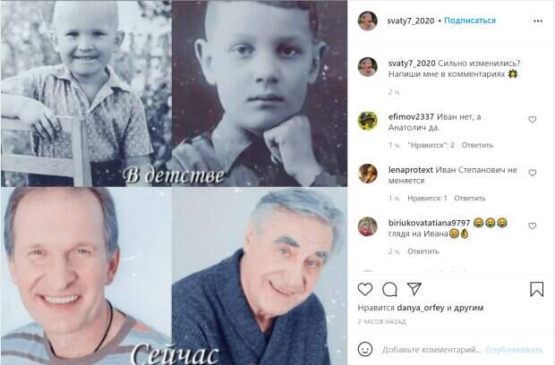 net. В Сети показали, как выглядели знаменитые Федор Добронравов и Анатолий Васильев, сыгравшие таких разных сватов Ивана Будько и Юрия Ковалева и веселивших зрителей своими приключениями. Фотография представлена в виде коллажа, где улыбающиеся актеры показаны в том возрасте, когда они появились в "Сватах". Смеющийся Федор Добронравов очаровывает своей неповторимой улыбкой, стоя вполоборота к камере, так же как и Анатолий Васильев радует хорошим настроением и добродушной улыбкой. Но совсем другими актеры предстали на своих детских фотографиях, которые были сделаны еще в черно-белом цвете. Маленький Добронравов уже с малых лет тренировался позировать перед камерой и оттачивал свое мастерство широко и искренне улыбаясь на снимке. Вероятно, чтобы не мучиться с волосами, родители маленького Феди стригли его налысо и одевали в простую одежду советского производства, поскольку Добронравов родился в простой семье, а его родители были обычными рабочими. А вот Анатолий Васильев был серьезным мальчиком, с детства проявлявшим интерес к театру и драме. На фото он позирует без улыбки, с важным видом подперев подбородок одной рукой. Мальчик носил короткую стрижку и отличался серьезным взглядом, хотя родился и вырос в семье советского чиновника, который пользовался авторитетом. Поклонники любимых актеров в комментариях к публикации отметили, что больше всех с детства изменился именно Васильев. "Иван нет, а Анатолич да", "Иван Степанович не меняется", "Стали ещё краше!!!", "Наши дорогие артисты Васильев и Добронравов", "Вы очень обаятельны!!!", "Обожаю их!!!", "Люблю вас",- написали фолловеры. Напомним, беда у звезды "Сватов" и "Моей прекрасной няни", в полиции раскрыли подробности: "Стала жертвой..." Как сообщала Politeka, Женька из "Сватов" вальяжно закинула ножку в кресле, выгнувшись кошечкой: "Wow, Wow, Wow…" Также Politeka писала, что довольную Валюху из "Сватов" засекли в объятиях с красавчиком, нежное фото: "Обожаю..."