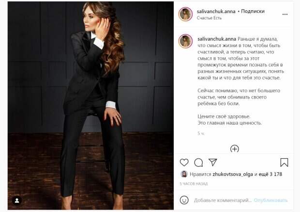 Из-под черного жакета выставилась белоснежная рубашка. Звезда была на длинных каблуках, она слегка расставила ножки, присев на стул. Актриса восхитила волнистыми волосами, упавшими ей на плечо. В посте звезда рассуждала о смысле жизни. "Раньше я думала, что смысл жизни в том, чтобы быть счастливой, а теперь считаю, что смысл в том, чтобы за этот промежуток времени познать себя в разных жизненных ситуациях, понять, какой ты и что для тебя это счастье. ⠀ Сейчас понимаю, что нет большего счастья, чем обнимать своего ребенка без боли. ⠀ Цените свое здоровье. Это главная наша ценность", - поделилась актриса. За пять часов публикация собрала более 3000 лайков и много комментариев. "Анечка , КРАСОТКА !❤️❤️❤️