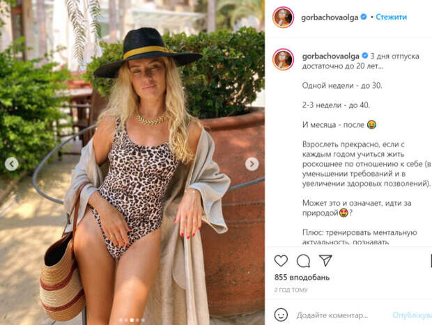 Она позировала в разных позах, демонстрируя стройные ножки и округлые бедра. «3 дня отпуска достаточно до 20 лет... Одной недели - до 30. 2-3 недели - до 40. И месяца – после. Взрослеть прекрасно, если с каждым годом учиться жить роскошнее по отношению к себе (в уменьшении требований и в увеличении здоровых позволений). Может это и означает, идти за природой?», - отметила артистка. В комментариях 40-летней красотке оставили массу приятных слов и комплиментов. «Прекрасно», «Красивая», «Какие длинные ноги», «Звезда», «Шикарно! И Вы, и написанный текст», «Девушка мечты», «Вам не дашь 40», - пишут пользователи сети. Напомним, что Ольга Горбачева заявила, что уходит: "Очень жалею о тех годах...". Еще Politeka писала, что Ольга Горбачева в миниатюрном купальнике удивила фигурой после 40: "Утрете нос 20-летним". Также Politeka сообщала, что Ольга Горбачева рассказала о своих страхах: "Самое сложное решение".