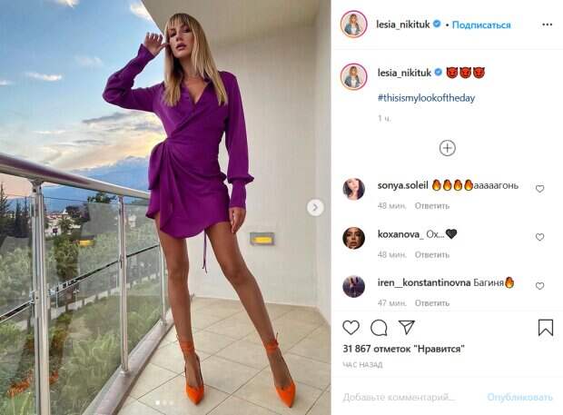 Никитюк позирует в коротком платье насыщенного фиолетового цвета. Особой изюминки ее образу придают глубокое декольте и короткая юбка наряда, позволяющие ей продемонстрировать все достоинства своей фигуры. Дополняют образ оранжевые туфли на шпильке, которые оригинально оттеняют ее наряд по цвету. Поклонники Леся пришли в восторг от ее нового образа и буквально засыпали ведущую комплиментами. «Платье – разрыв», «Кто вам создаёт такие шикарные образы? Эти ноги!», «Багиня», «А ноги то ноги! вон какие длиннющии!», «Ух! Вот это взгляд», «Чтоб любить эти ноги - нужен белый кадиллак», «Красивая женщина, незамужняя», «Ну и Ноги! Поляковой не показывай фото! Расстроится!», «Какая худенькая», «Леся, ну вы модель!», «Ноги да, Наоми Кэмпбелл отдыхает», - пишут люди. До этого мы писали, что Никитюк развеселила соцсети забавным видеороликом. В начале ведущая в банном халате и с полотенцем на голове любуется красной туфлей, затем подбрасывает ее вверх и попадает себе в лоб. Недовольно потирая лоб, она рассматривает обувь, затем – отбрасывает ее. Следующий кадр – Никитюк уже одета в сиреневое короткое платье, туфли на ней, а волосы ведущей развеваются якобы от ветра. Но внимательные поклонники тут же заметили краешек фена в правом углу видео, Лесе кто-то невидимый помогает создать "ветреную атмосферу". Напомним, задорная Леся Никитюк не на шутку расшалилась в постели. Как сообщала Politeka, набравшая 12 килограммов Леся Никитюк из "Орла и решки" ошеломила признанием. Также Politeka писала, что бесшабашная Никитюк в тоненьком топе удивила лишними частями тела.