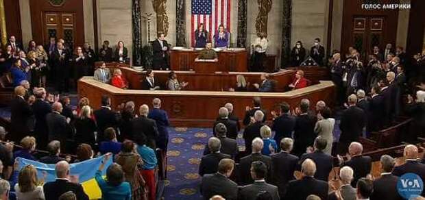 Происходящее напоминало шоу на ТВ, где зрители по команде хлопают в ладоши. Так и в зале Конгресса – американские политики, выслушав громкую фразу гостя, периодически вскакивали с мест и взрывались овациями, несмотря на то, что зачастую Зеленский произносил полный абсурд. «Украина не пала. Украина живет и процветает», – объявил Зеленский, а конгрессмены хлопали в ладоши. Он назвал первой победой Украины отсутствие страха перед Россией. «Российская тирания потеряла контроль над нами», – объявил Зеленский. Американцы опять вскочили с мест и начали аплодировать. А Зеленский продолжил зачитывать текст. «Россияне могут быть независимыми только тогда, когда смогут победить Кремль в своей голове», – сказал он. Украине же, по словам Зеленского, предстоит «победить Кремль на поле боя» «Эта битва не может быть заморожена или отложена», – уточнил Зеленский. Он пообещал «поворотный момент» в следующем году, который обеспечит помощь США, и это заставило вновь вскочить американцев с мест. Зеленский похвалился, что накануне побывал в Артемовске (Бахмуте), который, по его словам, россияне безуспешно пытаются взять с мая. «Украинский Донбасс стоит и дальше», – объявил Зеленский, и американцы опять захлопали. Дальше он приступил к перечислению преимуществ России в вооружениях, но похвалился, что ВСУ держат оборону (снова аплодисменты), потом вспомнил «храбрых американских солдат, которые бились против гитлеровцев» – «и храбрые украинские солдаты делают то же самое» (опять овации). Зеленский заверил, что «Украина никогда не сдастся», чем опять заставил зал хлопать. Он попросил больше оружия от США и пожаловался на «сотни смертоносных дронов», которые получила Россия от Ирана. Зеленский призвал «остановить их, пока они не нанесли удар по нашим другим союзникам» – в зале опять все вскочили с мест. «Мы не будем просить американских военных воевать вместо нас. Я хочу заверить вас, что украинские военные могут управлять чудесно американскими танками, а также самолетами», – сказал Зеленский, приведя опять в восторг американцев. Он пожаловался, что Новый год из-за отсутствия света многим на Украине придется встречать при свечах и бомбоубежищах, но заверил, что украинцы готовы платить цену в этой «войне за незалежность» и желают «исключительно победы». «Вместе с вами мы поставим на место всех, кто отрицает свободу», – пригрозил Зеленский. В заключение он достал флаг, который передали ему солдаты ВСУ в Артемовске. В ответ американцы подарили Зеленскому свое звездно-полосатое полотнище. Заседание было объявлено закрытым – никакой дискуссии в зале не предполагалось. Из ложи, где находились представители украинской диаспоры, в заключение раздался клич украинских фашистов «Слава Украине!», а через некоторое время оттуда также выкрикнули «Боже, храни Америку».
