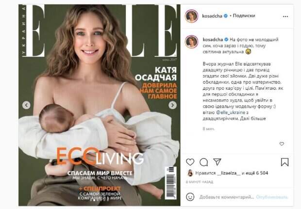 В этот раз красотка показала, как позировала для модного глянца. Осадчая вспомнила все свои фотосессии для этого журнала. "На фото не младший сын, хотя сейчас и кормлю, поэтому фотография актуальна Вчера журнал Elle отметил двадцатую годовщину и дал повод вспомнить свои съемки. Две очень разные обложки, одна о материнстве, вторая о карьере и цели. Помню, как для первой обложки я неистово худела, чтобы войти в свою идеальную модельную форму :)", - написала Катя. Фанаты поставили более 6 тысяч лайков и написали комментарии: "Как красиво", "Какая необычная и красивая", "Вы очень красиво выглядите", "Красавица Катя", "Прекрасные, вдохновленные фото", "На первом фото я подумала, что это Сара Джессика Паркер. Вы очень красива". Напомним, Горбунов в черном костюме устроил дерзкие танцы в гримерке перед Осадчей А еще Politeka писала, что Осадчей предрекли проблемы со здоровьем и финансами Такжже Politeka сообщала, что Осадчая в эффектном наряде прикрыла лицо сеточкой, очаровав загадочным видом