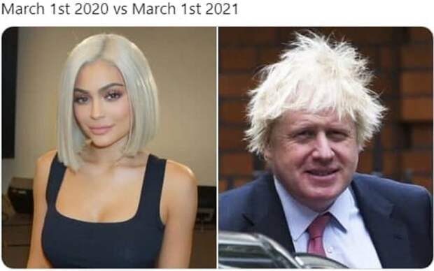 Спустя 12 месяцев после начала первых ограничений в сети стали появляться различные мемы, посвященные годовщине пандемии Covid-19. Большинство авторов шуток выбирают различных актеров или популярных персонажей поп-культуры: на левой картинке персонаж изображен молодым, а на правой — уставшим, постаревшим.