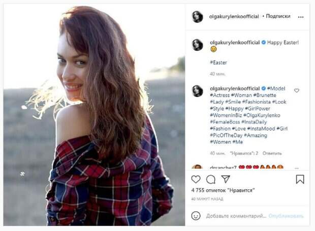 Девушка принимает участие в съемках и сейчас, не забывая подогревать к себе интерес в социальных сетях. В этот раз звезда опубликовала фото в Инстаграм, где показалась в рубашке, которую спустила с плеч. Красотка стояла на улице, закрывая головой солнце, благодаря чему волосы у Ольги светились. "Счастливой Пасхи", - написала звезда под фотографией. Фанаты поставили почти 5 тысяч лайков и написали комментарии: "Прекрасная дама", "Счастливой Пасхи", "Вау, великолепная Ольга", "Великолепно!", "Красота наизнанку", "Как всегда потрясающе", "Счастливого пасхального воскресенья". Мы писали, что известная актриса Ольга Куриленко поразила ярким звездным образом. Так, в аккаунте знаменитости появилась фотография, на которой она позирует в синем платье с обнаженной спиной и машет рукой в сторону камеры. Куриленко не стала рассказывать, где и когда было сделано фото. Напомним, украинская девушка Бонда Куриленко в дерзкой позе позволила заглянуть в декольте А еще Politeka писала, что украинская девушка Бонда Куриленко без белья впечатлила платьем для красной дорожки Также Politeka сообщала, что украинская девушка Бонда Куриленко подразнила беззаботным образом в необычном платье