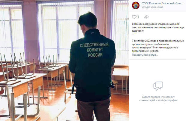 По поручению председателя СК России Александра Бастрыкина в центральный аппарат ведомства был представлен доклад. Следствие установило, что подросток получи травму в одной из школ Пскова. Сверстник потерпевшего поссорился с ним во время урока и ударил кулаком в живот. В результате несовершеннолетнему причинен тяжкий вред здоровью. Следователи осмотрели место происшествия, назначили необходимые экспертизы, допросили очевидцев. Следствие продолжается. Напомним, СМИ писали, что ссора произошла из-за личных вещей. В результате удара у пострадавшего подростка произошел разрыв селезенки, он находится в реанимации.
