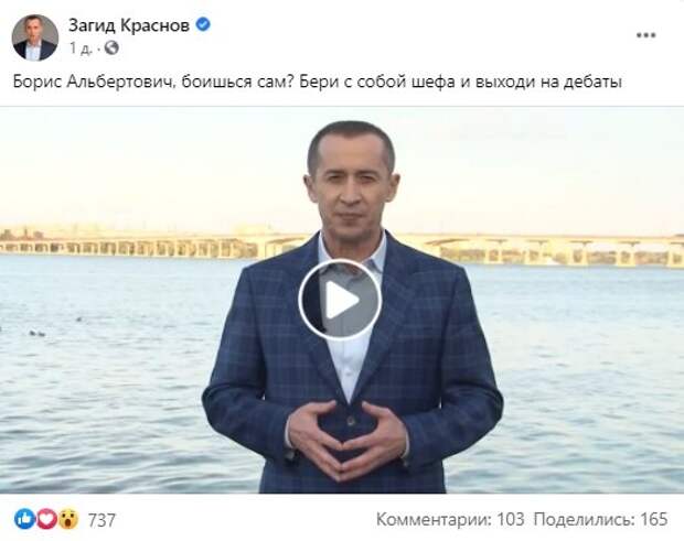 Лидер «Громадской силы» Загид Краснов в соцсетях выложил видео, в котором заявил, что если Борис Филатов боится выйти с ним на дебаты один на один, то может взять с собой Геннадия Корбана. Как известно, Краснов и Филатов являются главными оппонентами на предстоящих выборах мэра в Днепре, и 16 октября лидер партии «Громадська сила» официально вызвал действующего городского голову на дебаты.