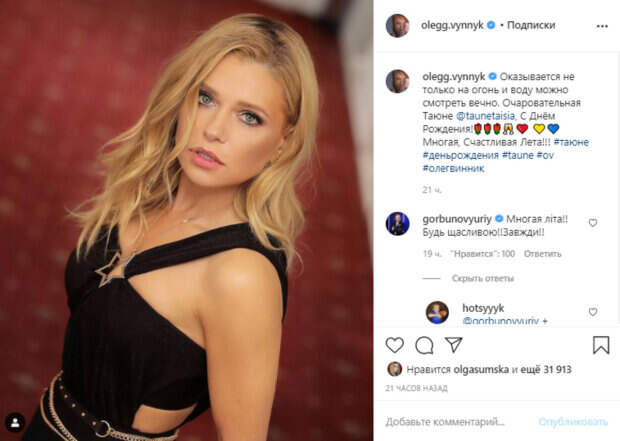 Певец Олег Винник похвастался в соцсети красоткой Таюне, которую называют его тайной женой Как передает Politeka.net, 47-летний артист эмоционально поздравил свою бэк-вокалистку Таюне (Таисию Сватко - настоящее имя) с днем рождения, опубликовав в Инстаграм ее фото. Таюне предстала в кадре в черном платье с соблазнительными вырезами и без нижнего белья.