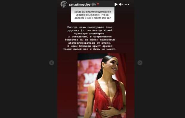 В уже знакомом образе экс-участница "ВИА Гры" позировала за кулисами шоу со счастливой улыбкой на лице. В своей публикации красотка ответила на вопрос одного из поклонников о том, как она относится к лицемерному отношению и лицемерным людям. "Иногда даже подыгрываю (под дурочку), но всегда кожей чувствую лицемерие. К сожалению, в современном обществе мы не можем полностью абстрагироваться от этого. В моем близком кругу друзей таких людей нет и быть не может", - заявила Димопулос в социальной сети. Стоит отметить, что в финале "Танців з зірками" Санта победила, но решила отдать свой кубок Юлии Саниной, которая заняла второе место. Солистка The Hardkiss не оценила жест и отказалась от награды, демонстративно поставив его на пол. Позже в интервью YouTube-каналу "Ходят Слухи" она публично раскритиковала поведение Димопулос и посчитала его унизительным. "Зная, что происходило за кулисами, как сильно ее команда хотела этой победы, говорить о том, что ей не нужна была эта победа, – ну это как минимум лицемерно", - подчеркнула Юлия Санина. Напомним, победительницу "Танців з зірками" Димопулос унизили на всю страну, кадры позора: «Как мокрая кошка…» Как сообщала Politeka, Димопулос посветила своей роскошью в белоснежных мехах: "Сокровища для. ..". Также Politeka писала, что Димопулос ослепила красотой в компании эффектных блондинок: "Новый состав ВИА Гры".