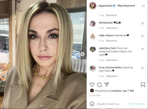 Видно, что над лицом артистки поработали визажисты, нанеся макияж с акцентом на глаза и подчеркнув губы легкой помадой натурального оттенка.. Изящным акцентом лука стала золотая цепь на шее артистки. «Будет красивый проект», - сказала Сумская фолловерам. При этом никаких подробностей она раскрывать не стала. Отметим, увидев Ольгу в эффектном образе, не устоял дажее ее супруг Виталий Борисюк. Он оставил комментарий с сердечками и «поцелуями». Актриса ему тоже ответила, правда, более сдержанно. «Шикарная женщина!», «Женщина-огонь», «Ах какая женщина», «Очень-очень-очень красиво», «Боже, какая вы красивая», «Эталон для женщин Украины», "Ольга, вы прекрасная, только лаза грустные", - пишут в комментариях. Напомним, 54-летняя Сумская выпендрилась "новой" внешностью, показав себя вблизи: "Могут позавидовать многие..." Как сообщала Politeka, 54-летняя Сумская прихорошилась в салоне красоты, заткнув за пояс молодых: "Как вам, друзья?" Также Politeka писала, что дочь Сумской блеснула пышной красотой рядом с сыном, которого скрывала с рождения: "Как вы гордитесь..."