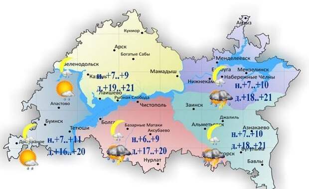 В пятницу, 1 июля, в Татарстане прогнозируется облачная погода с прояснениями. Временами дожди, днем и вечером в отдельных районах с грозой. Максимальная температура воздуха днем в Татарстане составит от +16 до +21 градус. В Казани ожидается от +19°С до +21°С. В Набережных Челнах синоптики прогнозируют от +18 до +21 градусов.
