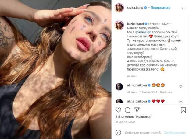Александра удивила переменами во внешности, "разрисовав" лоб и щеки. "Етеншн!! Бьюти-маньяк снова онлайн. Мы с @arleysign сделали вот такие временные тату