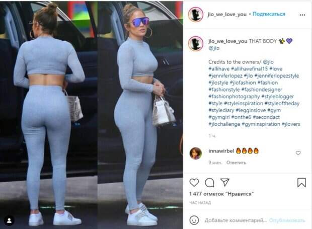 Певица и актриса Дженнифер Лопес во время прогулки показала пышную фигуру Большинство личных и не постановочных фото Дженнифер всегда удивляют сеть, ведь артистка демонстрирует фигуру не такую, как на кадрах в своем профиле. Как правило, на реальных снимках фигура Лопес более пышная и заметная. На одних из таких кадров звезда была замечена в светло-сером костюме, состоящем из простых лосин и топа.