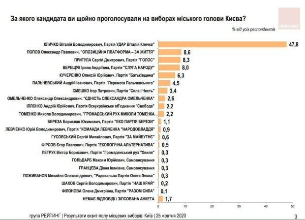 " (39,52%). В Одессе жители доверились Геннадию Труханову (34,4%) и партии "Довіряй ділам" (23,77%). Во Львове предварительно больше всего голосов набирает действующий мэр Андрей Садовый (38% по данным экзитпола Fama). В Днепре фаворитами являются нынешний городской голова Борис Филатов (44,7%) и партия "Пропозиція" (28,33%). В Кривом Роге на выборах мэра лидирует действующий городской голова Юрий Вилкул, у него 42,80% голосов. Во втором туре его оппонентом будет Дмитрий Шевчик из "Слуги народа". В Мариуполе, по данным опроса, в первом туре победил действующий мэр Вадим Бойченко – без шансов для других кандидатов. Мэра Николаева будут выбирать во втором туре, где встретятся Александр Сенкевич и Владислав Чайка. В Виннице на выборах мэра города лидирует Сергей Моргунов, который представляет партию "Украинская стратегия Гройсмана". В Черкассах есть неплохие шансы на новый срок у мэра Анатолия Бондаренко, который представляет партию "За майбутнє". Но во втором туре его ждет кандидат от "Голоса" или "Слуги народа". В Ужгороде прошла довольно напряженная борьба за кресло мера. Во втором туре, видимо, сойдутся Богдан Андреев и Виктор Щадей, разрыв между которыми составляет около одного процента. В Черновцах также состоится второй тур выборов мэра, но лидирует бизнесмен Роман Кличук, который набрал почти треть голосов. Действующий мэр Запорожья Владимир Буряк может победить в первом туре. Мэром Ивано-Франковска уже в первом туре может стать действующий городской глава Руслан Марцинкив ("Свобода"). По результатам экзитпола, он получил 86,1% голосов. Действующий мэр Чернигова Владислав Атрошенко, по данным местного экзитпола, одержал победу на местных выборах в первом туре, набрав 85%. 25 октября в Украине состоялись выборы, украинцы выбирали депутатов местных советов, а также сельских, поселковых и городских глав. В Ровно, согласно данным экзитпола "Сфера ТВ" и возможность минимальной погрешности, шансы на кресло мэра есть сразу у трех кандидатов: Виктор Шакирзян ("Рівне Разом") – 18,61% Виталий Коваль ("Слуга народа") – 18,05% Александр Третьяк ("Европейская солидарность") – 15,41% Но согласно опросу от ITV, Шакирзян получает 21,3%, а Коваль и Третьяк – по 15,8%. В Тернополе мэр Сергей Надал переизбрался на еще один срок, за него проголосовали 72,3%. В Хмельницком действующий глава города Александр Симчишин набрал более 80%. А на выборах в горсовет его политическая сила получила почти 2/3 голосов. Предварительно, во второй тур выборов мэра Херсона выходят Игорь Колыхаев и Владимир Сальдо. В Сумах за пост главы города лидирует нынешний мэр города Александр Лысенко от ВО "Батьківщина". 25 октября в Украине состоялись выборы, на которых украинцы выбирали депутатов местных советов, а также сельских, поселковых и городских глав. Как заявили в ЦИК, примерно 15 ноября могут назначить второй тур выборов мэров, если ни один кандидат в крупном городе не наберет более 50% голосов. Экзит-пол проводится для контроля честного подсчета голосов на местных выборах в Украине. Интервьюеры опрашивали каждого !!!! украинца на выходе из избирательных участков. Полученные результаты экзитполов должны предоставить достоверную информацию о том, как голосовали избиратели, до того, как будут известны данные о подсчете голосов от Центральной избирательной комиссии. В июле 2020 года в Избирательный кодекс Украины внесли 