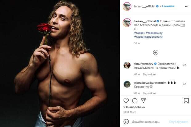 Муж Наташи Королевой, актер и стриптизер Сергей Глушко (Тарзан) сегодня отмечает свой профессиональный праздник, в связи с чем порадовал поклонниц пикантным фото Об этом сообщает Politeka со ссылкой на страницу Тарзана в соцсети. Так, артист запостил в своем аккаунте фотографию, на которой он позирует с обнаженным торсом, держа в руках красную розу.