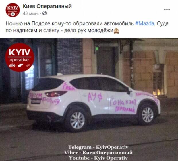 В Киеве ярко разрисовали автомобиль, который был припаркован на улице Как передает Politeka.net, об этом сообщает "Киев оперативный" в Facebook. Машина была припаркована на одной из улиц на Подоле. Неизвестные просто обрисовали все авто: двери, багажник, капот. Есть вероятность, что это сделали подростки.