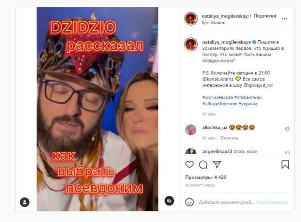Наталья Могилевская задала Дзидзьо (Михаилу Хоме) интересный вопрос, на что артист с удовольствием ответил Как пишет Politeka.net, Наталья Могилевская является сейчас успешной певицей, а также капитаном команды "Співають всі". Красотка на шоу записала видео с Дзидзьо, опубликовав его в Инстаграм. На видео Могилевская задала вопрос: "Как выбрать себе звездный псевдоним или нужно оставлять свою фамилию, как правильно поступать?