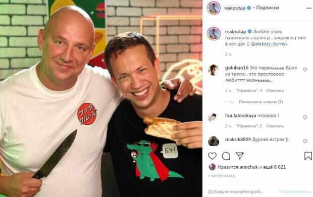 Кадр получился забавным, однако ситуация была немного опасная, ведь Потап держал в руках длинный нож и направил его в сторону Дурнева. Последний держал в руке хот-дог. Оба улыбались и выглядели довольно непринужденно. "Люблю этого пафосного засранца, закусенец мне в хот-дог