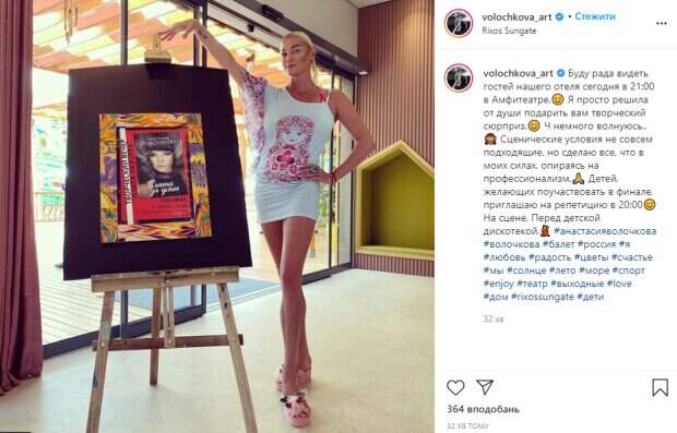 Настя стояла возле мольберта, на котором была прицеплена листовка с ее концертной программой, и картинно взмахнула рукой. В этот момент балерина засветила татуировку на запястье. Известно, что эти иероглифы от сглаза Насте делал под Бангкоком тот же монах, что набивал тату и голливудской актрисе Анджелине Джоли. В подписи к фото Волочкова проговорилась о сюрпризе, который готовит другим отдыхающим: "Буду рада видеть гостей нашего отеля сегодня в 21:00 в Амфитеатре.