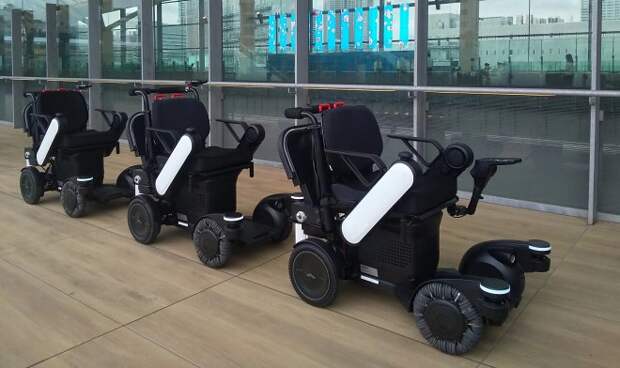Panasonic тестирует в Токио новую роботизированную систему транспортировки. Она представляет собой три электрических самоходных кресла с заложенной программой «Следуй за лидером».