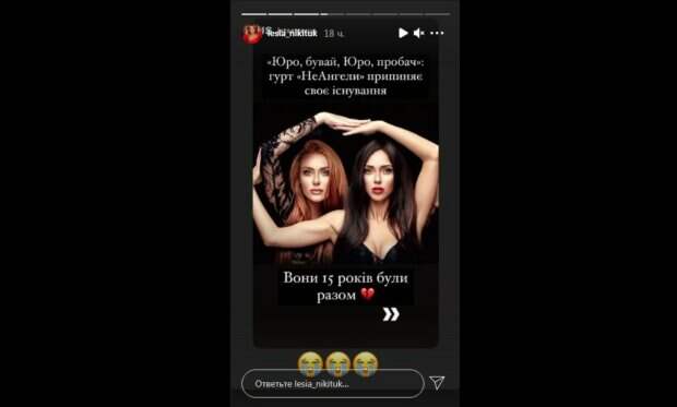 В своей Сториз она опубликовала фотографию солисток и плачущий смайлик. С ней полностью солидарна многомиллионная армия фанатов, которая имелась у этого популярного дуэта Песни Славы Каминской и Виктории Смеюхи звучали много лет. На сцене за все 15 лет выступлений группа ни разу не меняла состав. Такое постоянство редко встречается в современных музыкальных коллективах. Например, группа "ВИА Гра" стабильно меняла свой состав. Некоторых певиц зрители не успевали толком запоминать. По словам продюсера группы "НеАнгелы" Юрия Никитина, совместная работа началась еще в 2006 году. Его продюсерская компания Mamamusic долго работала с Славой Каминской и Викторией Смеюхой. Как стало известно, солистки Слава и Виктория станут делать сольные карьеры. Все права на песни, которые исполнялись "НеАнгелами", как и само название, будет принадлежать продюсерскому центру Mamamusic. У Виктории и Славы будет теперь свой личный репертуар. За все время существования группа добилась поразительных успехов. Самый первый дебютный альбом стал "Золотым диском". Девушки успешно выступали со знаменитостями. Например, со Стасом Костюшкиным, Dana International. Приятные, низкие голоса резко выделялись на фоне девичьих групп. Особо запомнилась песня со строками:"Юра прости, Юра прощай". Все эти годы каждый сингл получал признание музыкальных радиостанций, нравился фанатам. Слава Каминская и Виктория Смеюха с теплотой вспоминают работу под руководством Юрия Никитина, которая их многому научила. В свою очередь Никитин также считает, что солисты выросли, а группа трансформировалась и менялась. Фанаты написали много жалостливых слов по поводу распада группы. Для поклонников может стать утешением то, что "НеАнгелы" смогут иногда давать закрытые концерты. Последнее выступление состоится 26 марта 2021 года. Он пройдет в столичном концерт-холле "Фридом". Напомним, продюсер "Не Ангелов" рассказал, что их ждет. Как сообщала Politeka, "Не Ангелы" распались. Также Politeka писала, супруга DZIDZIO прекрасна, как Ангел