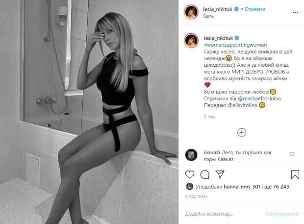 Так, субботним утром звезда порадовала фанатов очередным пикантным фото. На нем она позирует в купальнике, сидя на кромке ванной. Звезда демонстрирует идеальную фигуру и длинные ноги. Отметим, что это – не просто фото. Публикуя черно-белый снимок на своей странице, Леся поддержала челлендж #WomenSupportingWomen. «Скажу честно, не очень вникала в этот челендж😁 я на съемках круглосуточно)) Но я за любой кипиш, цель которого МИР, ДОБРО, ЛЮБОВЬ особенно мужество и красота женщины❤️ Всем шлю ростки любви😗 Получила от @mashaefrosinina. Передаю @elisvitolina 😉», – подписала снимок Никитюк. Фанаты не замедлили с ответной реакцией на такой красивый и дерзкий образ. «Лара Крофт ❤️🔥», «Какая же вы красавица😍», «Леся, когда ты поразишь миллионера наповал?», «Самая прекрасная женщина в мире», «Леся, ты горячая, как горы Кавказ», – пишут в комментариях. Возвращаясь к теме челленджа «Женщины спасут мир», отметим, что его условие – разместить в соцсети свое черно-белые фото и отметить тех, кем восхищаетесь и чьи моральные ориентиры разделяете. «Пускай мир знает, что мы также против конфликтов, дискриминации, насилия и войн», – написала у себя в Инстаграм телеведущая Маша Ефросинина, которая и передала эстафету Лесе. Та же в свою очередь, тегнула известную теннисистку Элину Свитолину. Напомним, Никитюк в наряде ночной жрицы и мрачного ниндзя высмеяли в сети: "Мусорного пакета не хватает". Как сообщала Politeka, бесстыжая Никитюк скопировала образ Ани Лорак и превзошла певицу. Также Politeka писала, что Никитюк в позе горячей кошечки бесстыдно посветила грудью.