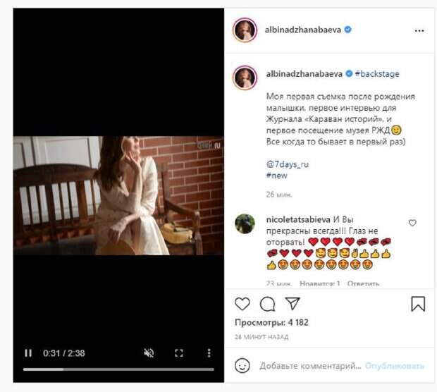 Фотосессия получилась чувственной и интересной. Видно, что Джанабаева уже начала активно восстанавливать себя после родов. "Моя первая съемка после рождения малышки, первое интервью для Журнала «Караван историй», и первое посещение музея РЖД Все когда то бывает в первый раз)", - написала Альбина под видео. Фанаты посмотрели ролик тысячи раз и написали комплименты: "Вы прекрасны всегда!!! Глаз не оторвать", "Умничка,Альбина! Я Вами восхищаюсь!", "Невероятно красивая", "Такая красивая, прямо". Напомним, экс-ВИА Гра Джанабаева показала подросших сыновей Меладзе на редком фото А еще Politeka сообщала, что 42-летняя экс-ВИА Гра Джанабаева сбежала от ребенка, поразив уставшим видом Также Politeka писала, что экс-ВИА Гра Джанабаева после родов решила показать, какой была до славы и брака с Меладзе