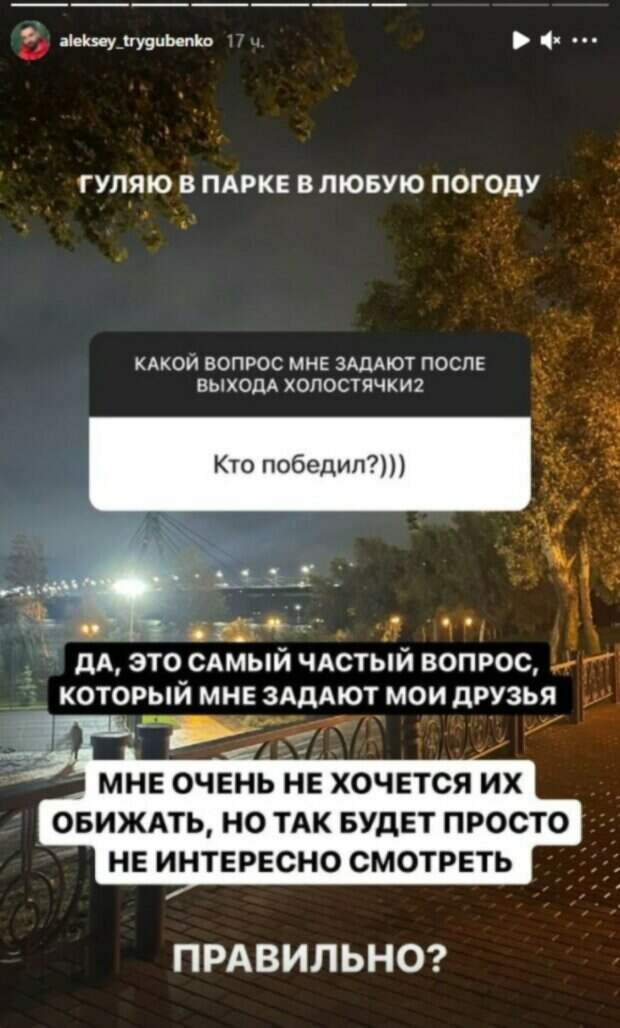 Поэтому Алексею пришлось поднять самую популярную тему за это время. Как оказалось, в последнее время Тригубенко все чаще встречает друзей. Которые задают ему один и тот же вопрос: «Лёша, ты не переживаешь, что вышел новый сезон, про тебя все забудут? Ты не в депрессии, все ли нормально?”. «Новый сезон вышел, про меня уже забудут. Когда я шел на проект, у меня не было цели стать известным. Я не мог быть уверен даже на 1%, что могу так далеко зайти, что обо мне узнают так много людей, увидит вся страна, а тем более, что полюбит. Я очень благодарен проекту за всё, что со мной в жизни произошло! Но, как вы знаете, после шоу я больше ушел в бизнес» - высказался Алексей. Он рассказал, что после этого жизнь его была обычной, он ходил на работу и приходил домой, как всегда. Со временем стал вам показывать немножко больше в Стори. «Раньше думал, что сначала нужно преуспеть в жизни, а потом уже показывать её, тем более ввести Instagram. Но потом осознал, что очень многие люди, которые сейчас на моем месте, которые тоже что-то пытаются создать, к чему-то стремятся, могут вдохновиться и подметить для себя какие-то моменты, которые помогут им. Спасибо всем, кто со мной! Обнял! » - выразил свои мысли мужчина. Отметим, Алексей Тригубенко, как и многие экс-участники первого сезона «Холостячки», начал смотреть второй сезон, а также выразил свое мнение по поводу увиденного. Причем все массово стали заваливать мужчину вопросами о самом шоу. «Как вы думаете, какой самый популярный вопрос мне сейчас постоянно задают, после того, как вышел новый сезон Холостячки? Да, спрашивают, кто победил. Это самый частый вопрос, который мне задают друзья. Мне очень не хочется их обижать, но так будет не интересно смотреть. Согласны?» - выразил свое мнение мужчина. Ранее сообщали, финалист "Холостячки" Тригубенко рассказал о своей любви, светясь от счастья Также, отвергнутый "Холостячкой" Мишиной Тригубенко нашел утешение вдали от родины Politeka рассказывала, финалист "Холостячки" Тригубенко обнародовал кадры со свадьбы на берегу моря