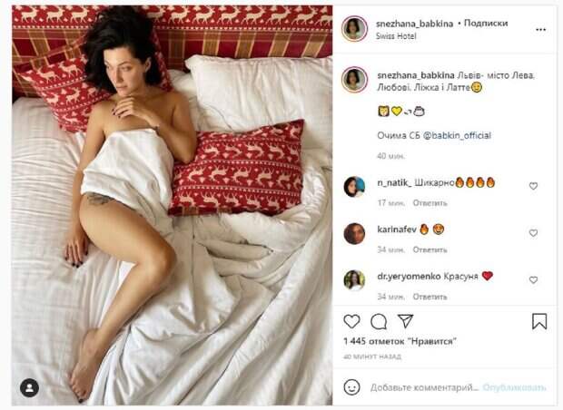 На новом фото Светлана показалась в постели. Красотка ничего не надела, поэтому прикрылась частично одеялом, демонстрируя роскошные ноги. Снимал в этот момент Сергей, как можно понять по подписи. "Львов - место Льва, любви, кровати и латте. Глазами Сергея Бабкина", - написала Светлана. Фанаты поставили тысячи лайков и написали комментарии: "Шикарно", "Красотка", "Вы волшебная", "Потрясающе вас видит", "Глаза мужа должны счастье видеть каждый день. Спасибо Сергею, что дает вас каждой из нас. Просто люблю", "Где такая красивая постель". Напомним, полет Бабкиных во Львов стал испытанием, у Снежаны началась истерика в самолете А еще Politeka писала, что жену Сергея Бабкина Снежану атаковала паника в старом самолете, фото Также Politeka сообщала, что жена Бабкина после измен мужа заговорила о боли и переменах в жизни