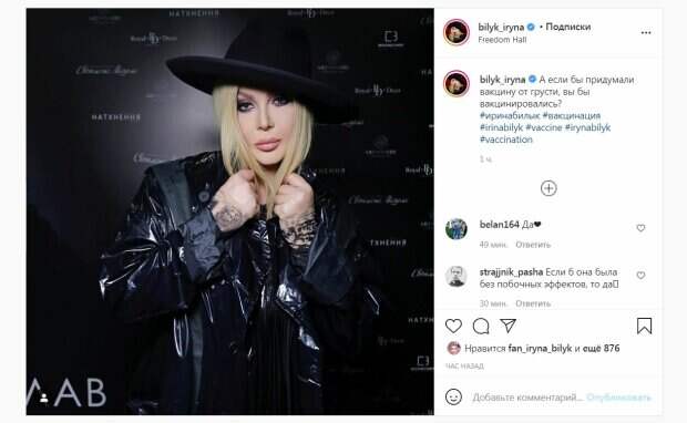 Последний отсвечивал из-за вспышки. Также под верхней одеждой можно заметить ткань в пайетках. Завершила стильный черный лук шляпка в цвет. Артистка смотрела в камеру из-под пышных ресниц. На лице звезды была легкая улыбка. "А если бы придумали вакцину от грусти, вы бы вакцинировались?", - написала певица. За час пост собрал почти 900 лайков и много комментариев: "Не-а, грусть - это искусство)) Без печали и грусти мы не были бы счастливы