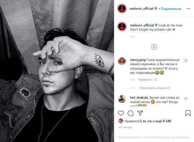 Известный украинский певец MELOVIN, которого многие помнят как фаворита Андрея Данилко на Евровидении, показал себя в образе «плохого парня» Константин Бочаров (настоящее имя певца) поделился новым черно-белым фото на своей странице в Инстаграм. Об этом пишет Politeka.net. На снимке певец позирует в томной позе, прикрыв лицо одной рукой, на которой можно заметить тату в виде человеческого глаза.
