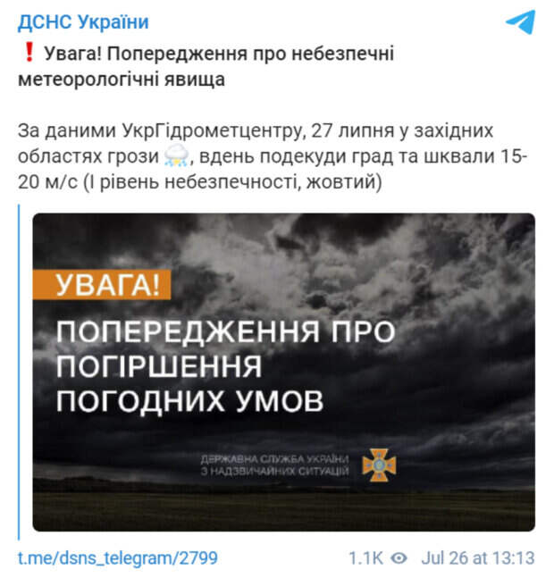 В Украине ожидается сильная непогода, которая нарушит покой украинцев Как пишет Politeka.net со ссылкой на данные Госслужбы по чрезвычайным ситуациям, во вторник, 27 июля, на Западе будет объявлен I уровень опасности, желтый. Синоптики прогнозируют, что во вторник в западных областях возможен град, грозовые дожди и шквалы ветра до 15−20 м/с.