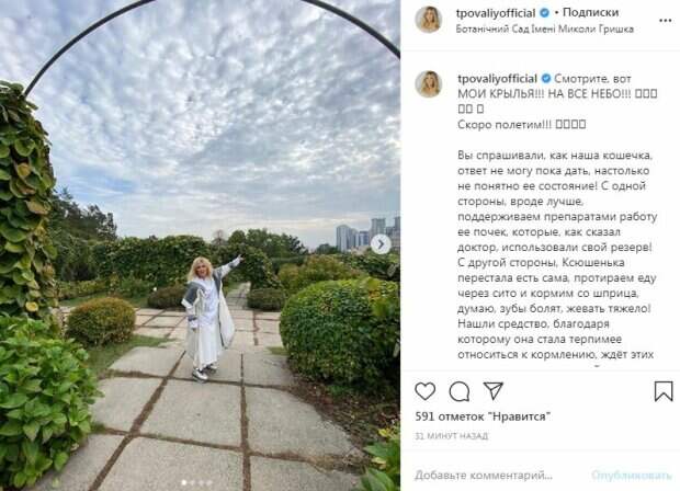 Скандальная украинская певица Таисия Повалий, которая выступает в России, рассказала о своих проблемах Звезда показала "свои крылья" на улице, сообщает Politeka.net. Повалий была одета в белую кофту и юбку, а сверху накинула плащ. Также певица обула кроссовки. При этом наряд никак не подчеркивал фигуру знаменитости.