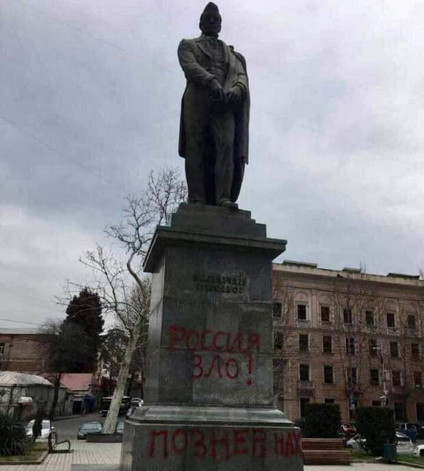 После скандала с российским журналистом Владимиром Познером в Грузии местные вандалы изрисовали краской памятник известному русскому поэту и дипломату Александру Грибоедову. Как передает корреспондент «ПолитНавигатора», на монументе написали «Россия – зло» и «Познер нах».