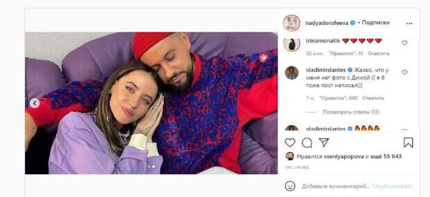 На видео Дмитрий и Надя ехали в автомобиле, где решили вместе станцевать и спеть под песню. На втором кадре Дорофеева показала, как она вместе с артистом отдыхала на диване. Монатик сидел на нем, а красотка пристроилась на плече у певца. "Дорогой мой Дмитрий Монатик. Таких людей, как ты - очень мало Таких артистов, как ты, ещё меньше... Я восхищаюсь твоим талантом, трудолюбием и человеческими качествами, которыми ты обладаешь. Хочу пожелать тебе, чтобы твое творчество продолжало радовать миллионы людей) Ты, как никто другой, несёшь добро и свет и попадаешь прямо в сердца. Я думаю, ты достоин ещё больших стадионов !! Люблю тебя, друг", - написала Надя. Владимир Дантес сразу прокомментировал публикацию супруги: "Жалко, что у меня нет фото с Димой (( я б тоже пост написал(((". Фанаты поставили десятки тысяч лайков и написали комментарии: "Обожаю всем сердцем ваш невероятный дуэт", "Лучшая пара друзей", "Вы наши пупсики", "Какие вы красивые". Напомним, Дорофеева ошарашила угрюмым видом на крыше многоэтажки А еще Politeka писала, что Надя Дорофеева перевоплотилась в Мадонну, Дантес зашел еще дальше Также Politeka сообщала, что проблемы с головой у Дантеса, Надя Дорофеева показала мужа в обычной жизни