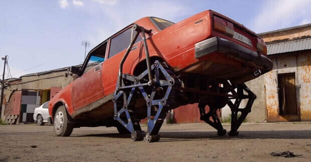 Автолюбители создали автомобильного робота-вездехода на базе советских Жигулей Вместо задних колес умельцы установили специальную металлическую конструкцию, которая позволяет «Жигулю» шагать. В задней части машины был установлен жесткий подрамник к которому и крепятся элементы шагохода. Дополнительно пришлось просверлить салон машины, чтобы проложить внутри две трубы.