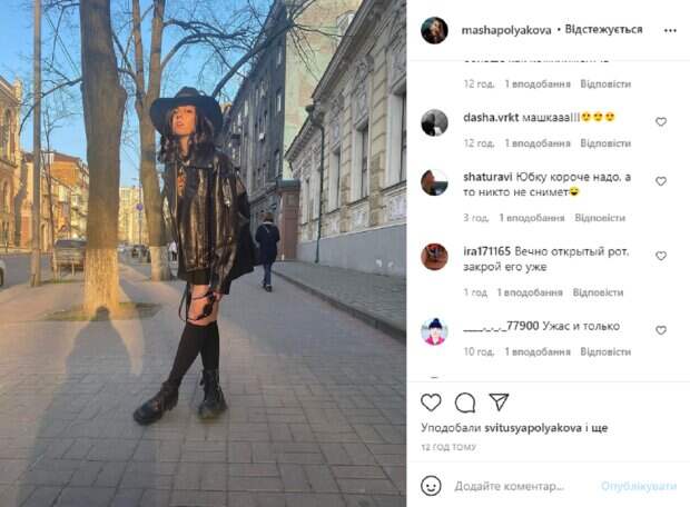 Так, в этот раз девушка опубликовала милый кадр с прогулки, на котором появилась в смелом наряде. Как видно, Мария запечатлена на улице, похоже, это в Киеве. Она вышла на прогулку в короткой темной юбке, черной кожаной косухе и массивных ботинках с челками. Недавно девушка отрезала свои длинные пышные волосы, а теперь, судя по снимку, еще и покрасила их темный цвет. Голову девушка прикрыла оригинальной темной шляпой, а на ее лице легкий макияж, она с вызовом смотрит в камеру. В подписи к публикации Полякова-младшая написала: "Как вам сегодняшняя погода, как вам причёска?". Конечно же пользователи принялись активно обсуждать новое фото Маши, правда большинство раскритиковали ее образ. "Боярский уже не тот", "На Halloween, в сам раз", "Красотка", "Причёска тебе очень идёт", "Просто ужас, куда смотрит Оля", "Не идет цвет", "Ужас и только", "Юбку короче надо, а то никто не снимет", "Вечно открытый рот, закрой его уже", - пишут в комментариях к фото Маши. Напомним, что Полякова, вытирая "слезы", покаялась перед Фреймут, Каменских и Монатиком: "Накликала, простите ребята!" Как сообщала Politeka, Оля Полякова в кокетливом халатике объявила, что покидает Украину, раскрыв детали: «Очень хочу…». Также Politeka писала, что мокрая Оля Полякова порезвилась на улице в одном купальнике, жаркие кадры: "с такой не замерзнешь".