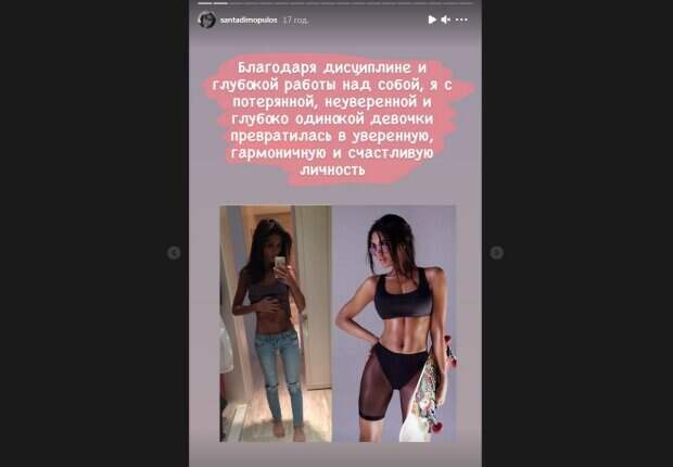 Певица Санта Димопулос победительница шоу "Танці з зірками" ошеломила своим перевоплощением Как передает Politeka.net, кадрами певица поделилась в своем Инстаграм. На одном из фото Санта Димопулос выглядит невероятно худой, ее привычных эффектных рельефов нет и в помине. «Благодаря дисциплине и глубокой работе над собой, я с потерянной, неуверенной и глубоко одинокой девочки превратилась в уверенную, гармоничную и счастливую личность», - призналась артистка.