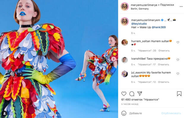 На этот раз актриса опубликовала новую серию фото на своей странице в Инстаграм. На кадрах Мерьем в многослойном платье, на которой красуются разные вставки ярких цветов. Свой образ девушка дополнила синей помадой. В подписи к фотографии Мерьем Узерли уточнила, что это образ птицы. Поклонники засыпали актрису разными комментариями, как и позитивными, так и негативными: "Сколько можно уродовать Мерьем", "Птица дивная", "Попугай", "Шикарная", "Наша королева", "Красивый образ". Ранее сообщалось, звезда "Великолепного века" Узерли поразила внешностью на редких фото с отцом-турком: "Похожи" Также, Узерли из "Великолепного века", приспустив платье, очаровала натуральной красотой: "Ой, ты такая..." Politeka рассказывала, звезда "Великолепного века" Узерли из гордой Хюррем превратилась в зефирную девочку, кадры перевоплощения: "Карамелька"