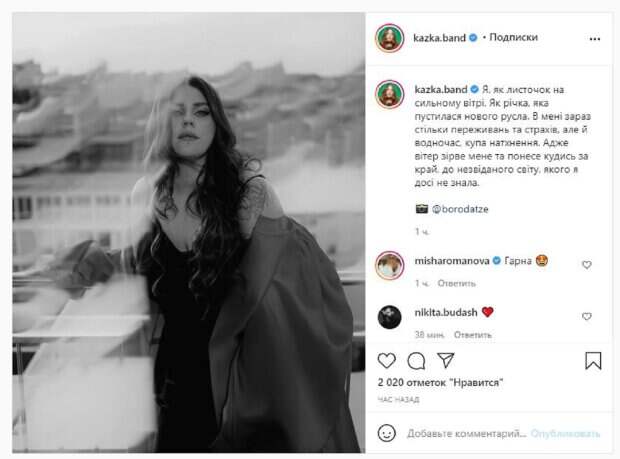 Девушка также активно ведет Инстаграм, где делится всем интересным. На новом фото Зарицкая позировала в черном платье, накинув сверху плащ. Фото было черно-белым, что добавило образу еще больше чувственности. "Я, как листик на сильном ветру. Как река, которая пустилась нового русла. Во мне сейчас столько переживаний и страхов, но и одновременно куча вдохновения. Ведь ветер сорвет меня понесет куда-то за край, к неизведанному миру, который я до сих пор не знала", - написала Зарицкая. "Красивая", - написала Миша Романова, бывшая солистка ВИА Гры. Фанаты поставили более 2 тысяч лайков и написали комментарии: "Только вперед", "Сентябрь - это время перемен", "Саша, у меня сейчас именно такие чувства". Напомним, солистка KAZKA Зарицкая блеснула формами в наряде с нескромным вырезом, есть повод Также Politeka писала, что солистка «KAZKA» Зарицкая после тренировок на «Танцях з зірками» показала чудеса растяжки А еще Politeka сообщала, что партнера Зарицкой из KAZKA по Танцях з зірками "рассекретили" в Сети, любимчик Кароль и Саниной