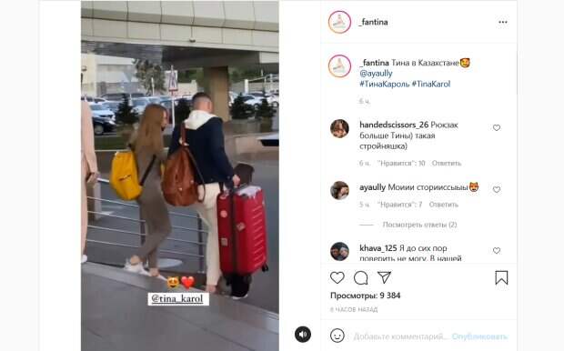 На фан-странице певицы в Инстаграм появились соответствующие кадры, пишет Politeka.net. Так, на видео, снятом одной из поклонниц, можно увидеть, как звезда выходит из здания аэропорта. Тина была одета по-дорожному удобно, а на ее лице красовалась маска. На спине у певицы висел большой желтый рюкзак. Звезду сопровождал высокий молодой человек, который нес большой чемодан. Его лицо сложно рассмотреть, однако можно предположить, что это – пиар-менеджер артистки Павел Орлов, который часто ее сопровождает. Поклонники не смогли не прокомментировать это видео. Больше всего оно порадовало жителей Казахстана. «Рюкзак больше Тины) такая стройняшка)», «до сих пор поверить не могу. В нашей аэропорту, нашем городе, это то, о чем я даже мечтать не могла», «Боже какая она красивая», «Не верится», «Эй Дантина!! вы тут Балана видите? нет... а он есть», «так близко», «Я не верю», «А кто это с ней? Этот высокий парень тоже в команде, кто он?», - пишут люди. Напомним, Тина Кароль светилась от счастья на свадьбе, выбрав необычный наряд: "Про все на свете с тобой забываю". Как сообщала Politeka, Тина Кароль удивила жестким нравом в обычной жизни, леди-босс: "Иногда жалко Олю". Также Politeka писала, что Кароль в белой пижамке пустила в свою спальню, умостившись на кровати: "Это о любви к себе".