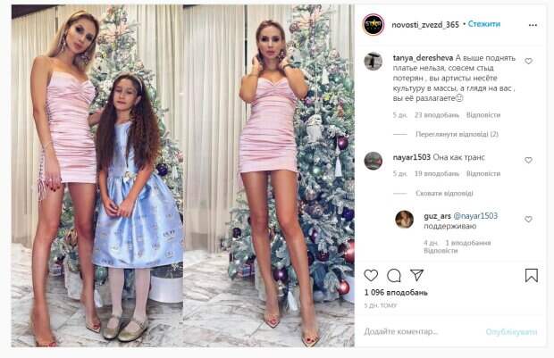 Девочка же нарядилась в пышное платье небесного цвета. Отметим, такой вид артистки стал предметом горячих споров. «Поделилась больше ногами, чем фото с дочкой», «А выше поднять платье нельзя, совсем стыд потерян, вы артисты несёте культуру в массы, а глядя на вас, вы её разлагаете», «Она как транс», «Забыла переодеть концертное платье? Можно и поскромнее было», «Плохо наверно, когда мама занимается собой, а не детьми, фото вроде рядом с доченькой, а как с шеста сняли», «Девочка смогла выбрать платье только в коронах
